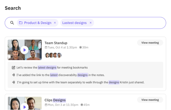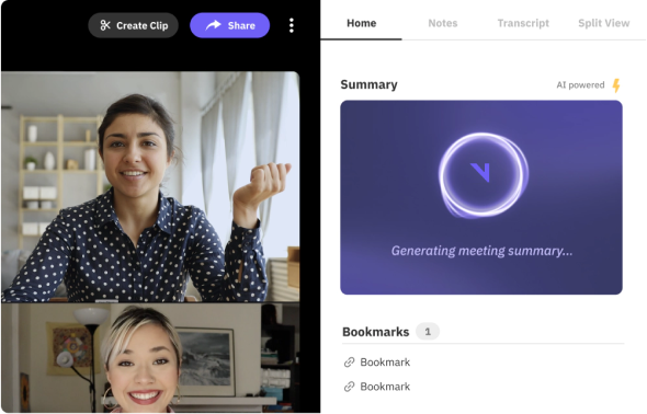 Use the power of search to look up anything that was covered in a meeting, then jump to that point in the video for instant context. Bookmark moments to easily find them later, or create clips to share insights and decisions with teammates.
