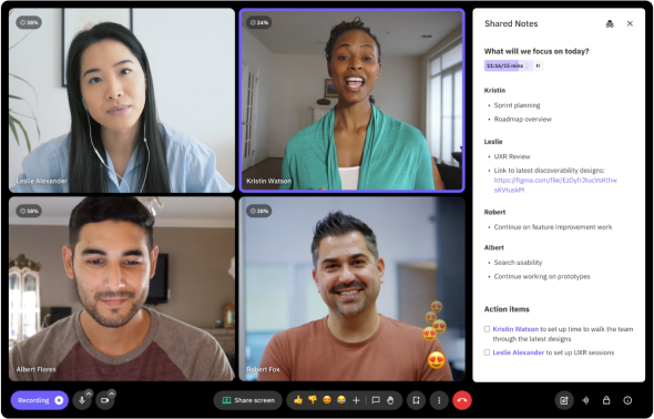 With agendas, timers, emojis, and notes that everyone can see, there’s less “what are we talking about?” and more “let’s get s*** done.” Plus, turn on live transcription with one click — no clunky add-ons needed.