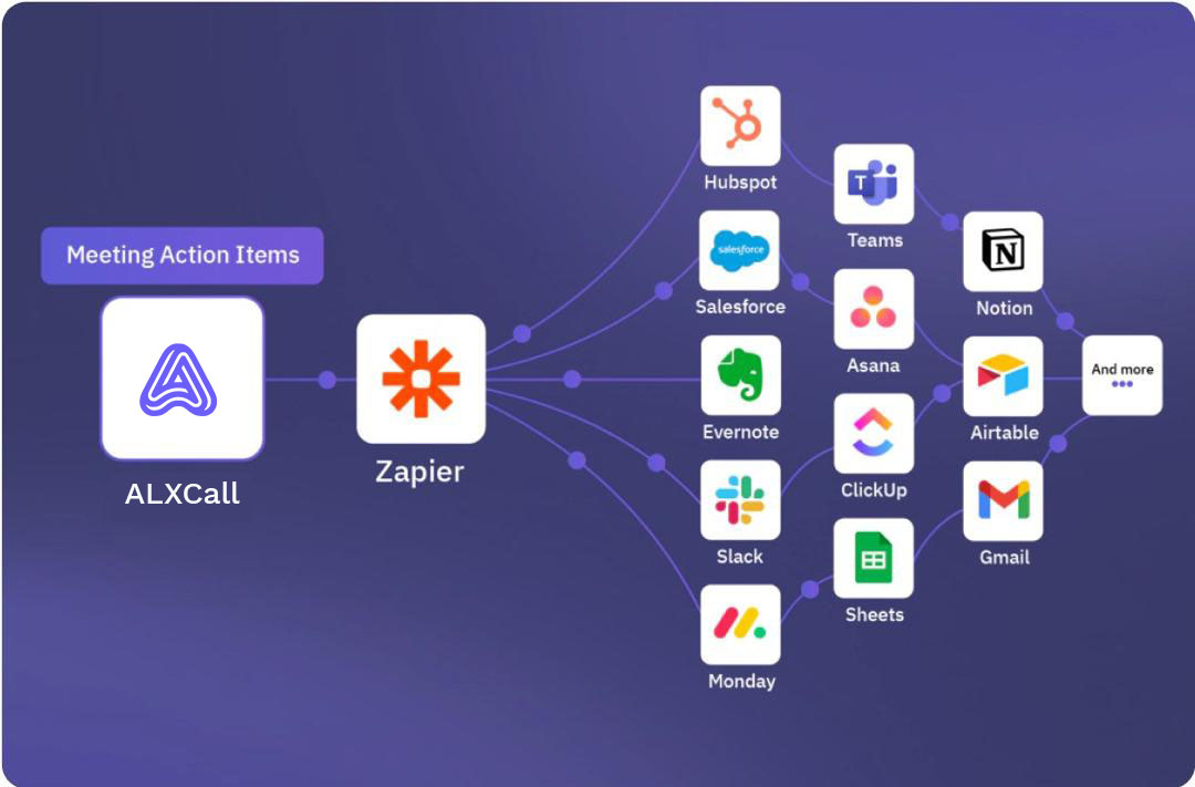Connect ALXCALL with 1000s of popular apps like Asana, Notion, and more. Automatically send your AI-generated meeting summaries, action items, and meeting notes for workflow automation.