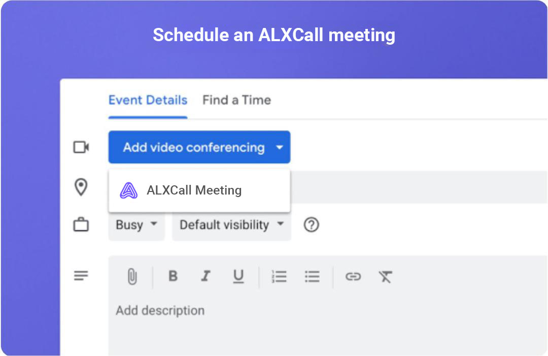 Easily schedule and join ALXCALL meetings directly from your Google Calendar. You can also see and edit your ALXCALL meeting agenda in the calendar invite.