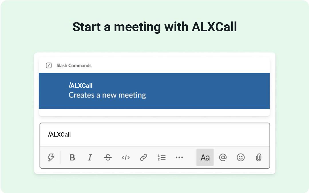 Post docs to Slack, @mention users, start a meeting, and receive ALXCALL notifications from your Slackbot. Type /ALXCALL in any channel or direct message and jump into a ALXCALL meeting with 1-click.
