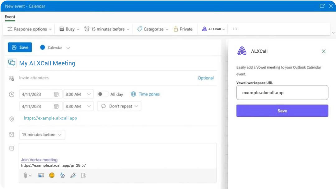 Easily add a ALXCALL meeting to any Microsoft Outlook calendar event. Use ALXCALL with Microsoft Outlook to schedule meetings with a single click.