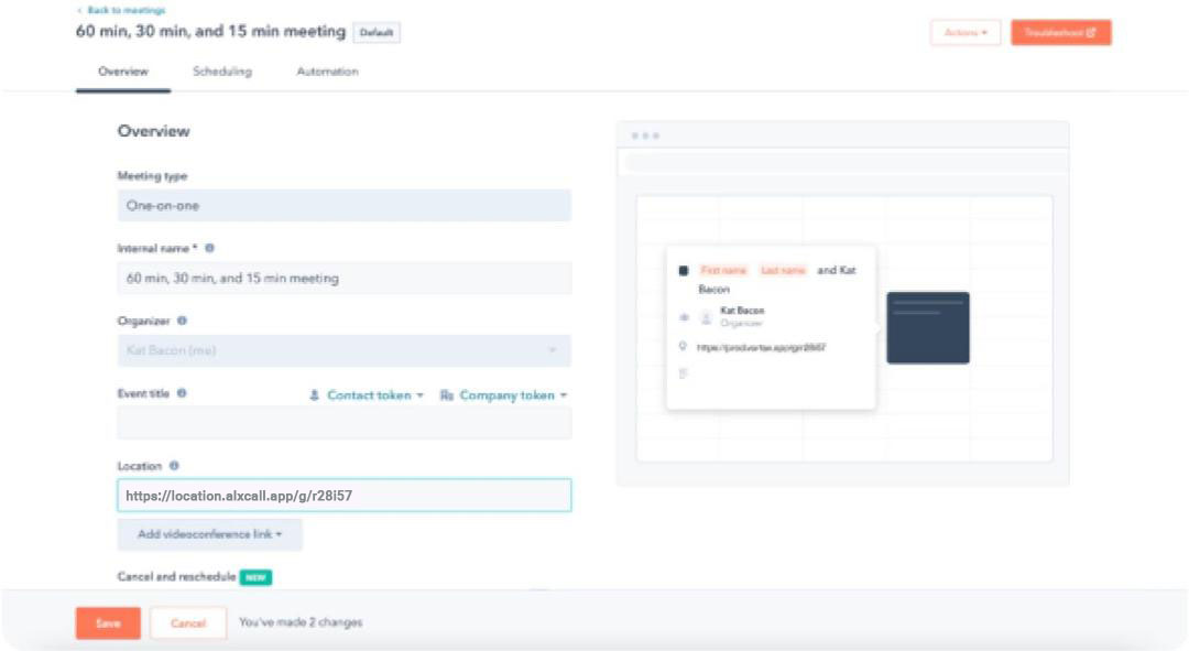 Auto-add ALXCALL meeting links to Hubspot events. A Google Calendar event will be created when someone books a meeting with you. Participants can join your ALXCALL meeting from the event.