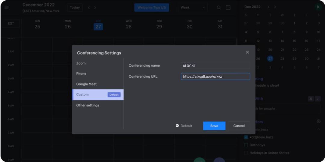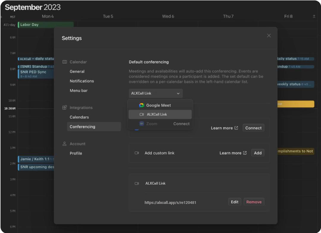 Auto-add ALXCALL meetings to Cron events. A Google Calendar event will be created when someone books a meeting with you. Participants can join your ALXCALL meeting from the event.